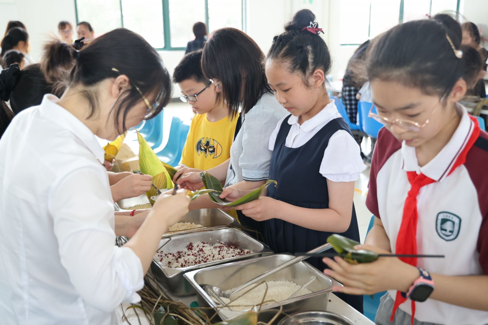 你拿粽葉我添米、你放餡來我纏線,小朋友們興致高昂,在家長的幫助和指導下,小朋友們也加入到包粽子行列。包好的粽子扁圓尖細、形態(tài)各異,有嬌小玲瓏型,有富態(tài)滾胖型,但相同的都是披上了“綠色、吉祥、歡樂”的外衣,整個下午,食堂里洋溢著濃濃的節(jié)日氣息,歡聲笑語不斷。