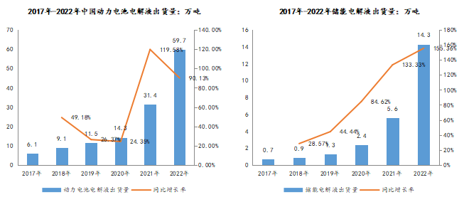 而2022年中國電解液出貨量達(dá)到89.1萬噸,同比增長75.74%,在全球電解液中的占比增長至85.43%。其中,中國動力電池出貨量480GWh,帶動中國動力電解液出貨量達(dá)到59.7萬噸,同比增長90.13%;中國儲能鋰電池市場出貨量130GWh,帶動儲能電解液出貨量達(dá)到14.3萬噸,同比增長155.36%。