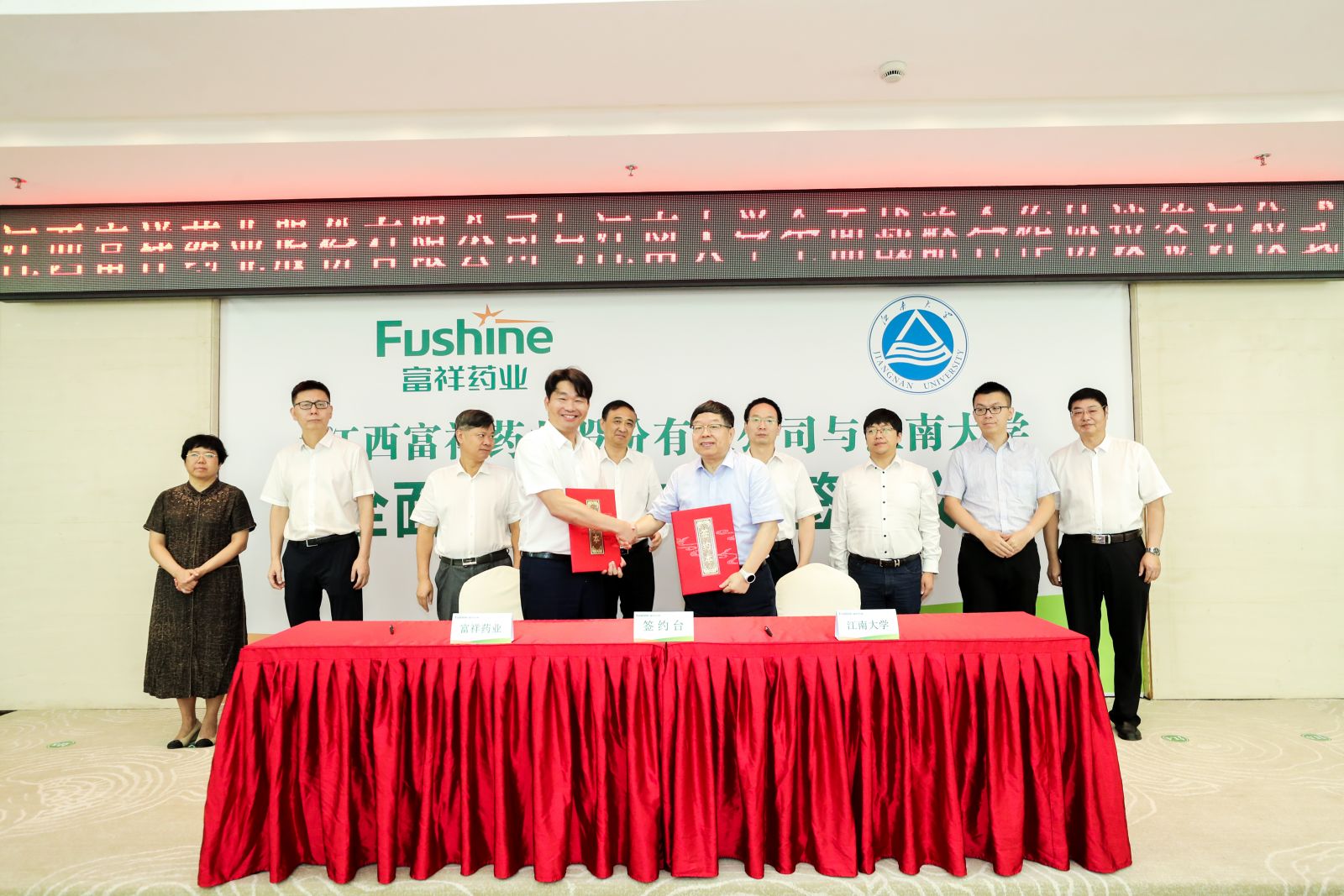 9月3日,江西富祥藥業(yè)股份有限公司與江南大學(xué)全面戰(zhàn)略合作協(xié)議簽訂儀式在景德鎮(zhèn)舉行。市委書記劉鋒,江南大學(xué)原校長(zhǎng)、中國(guó)工程院院士陳堅(jiān),江南大學(xué)副校長(zhǎng)、長(zhǎng)江學(xué)者特聘教授堵國(guó)成,市人大常委會(huì)副主任、市委秘書長(zhǎng)羅建國(guó),副市長(zhǎng)、高新區(qū)黨工委書記羅文軍、富祥藥業(yè)董事長(zhǎng)包建華等出席儀式。高新區(qū)管委會(huì)主任、昌江區(qū)委書記倪衛(wèi)春主持儀式。市科技局黨組書記虞萍、副董事長(zhǎng)李惠躍、董事程榮武以及公司高管、江南大學(xué)博士參加儀式。